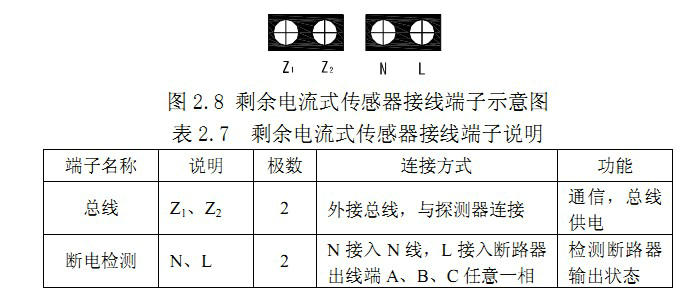 剩余电流式传感器接线端子如图 2.8所示,具体接线说明如表 2.7。